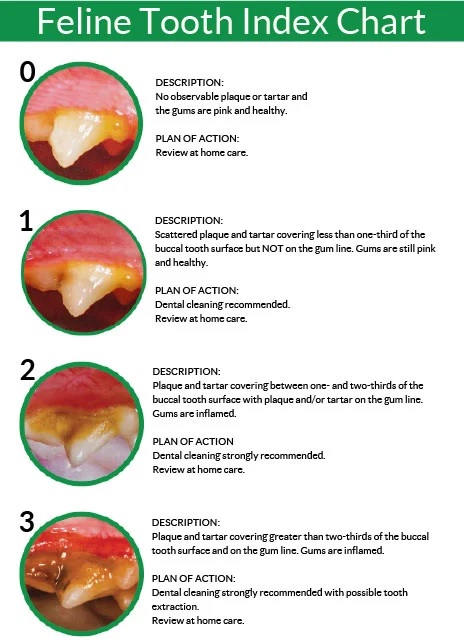 A descale and polish under anesthesia is a proactive approach to combat Grade 1-2 dental disease. This procedure involves the careful removal of plaque and tartar buildup, along with a thorough cleaning of the teeth and gums. It's a minimally invasive process that aims to halt the progression of dental issues and maintain oral health. Grade 1-2 dental disease may be in its early stages, but its impact on your pet's well-being should not be underestimated. By recognizing the signs and seeking professional care promptly, you're taking a proactive step towards ensuring your pet's oral health and overall happiness. Look at the dental grade charts below to see where your pet fits.